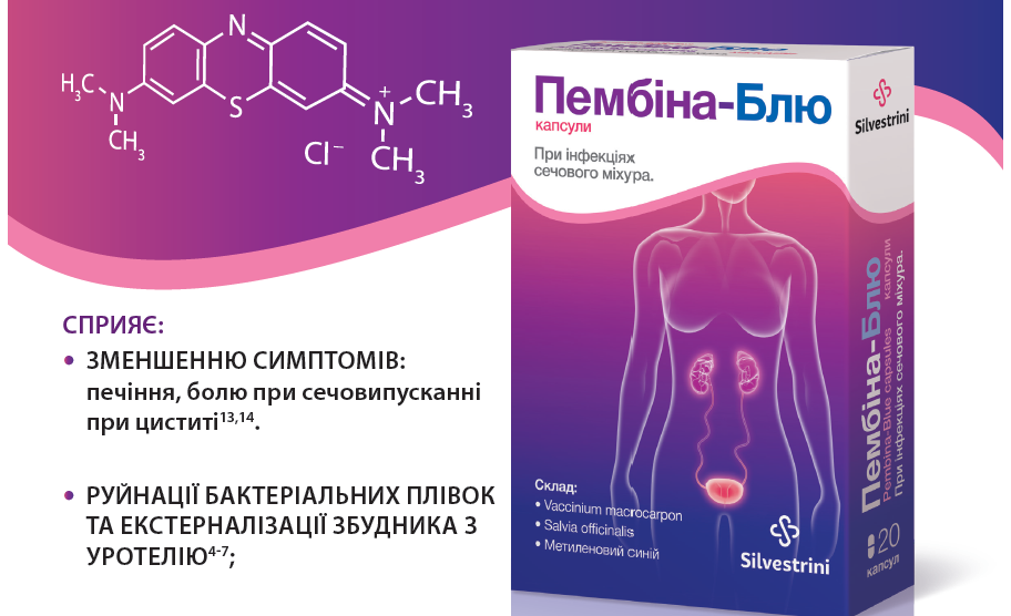 3. Демонструвати бактерицидний ефект змушує звернути пильну увагу на препарати з метилтіонінію хлоридом (МТХ) для лікування основних симптомів циститу: дизурії, болю при сечовипусканні і зниження ризику рецидивів!