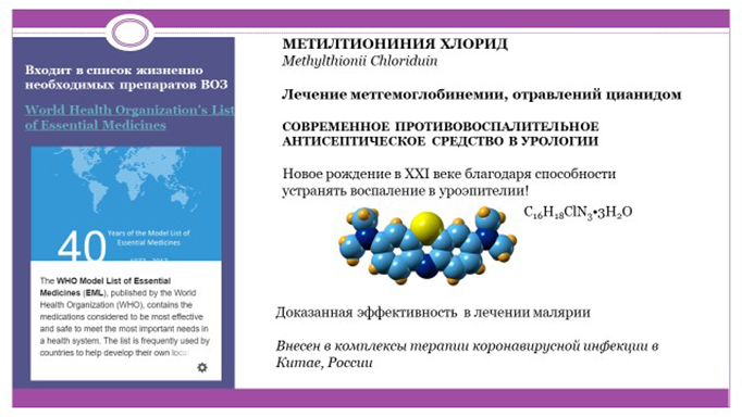 Метиленовый синий (метилтиониния хлорид) – производное фенотиазина, относится к списку жизненно важных препаратов ВОЗ для лечения метгемолгобинемии (отравлениях цианидами, угарным газом). Похожий процесс разрушения гемоглобина (Hb) совсем недавно был обнаружен как осложнение коронавирусной инфекции.