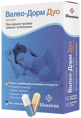 Опис: Валео-Дорм Дуо створений для пацієнтів з першими проявами тривоги і безсоння. Валео-Дорм Дуо - комбінація двох компонентів у різних блістерах Relax і Sleep. Комплекс рослинних екстрактів що містять фітофлавоноїд кризин (модулятор ГАМКа- рецепторів) в капсулі Relax сприяє зменшенню тривоги.
